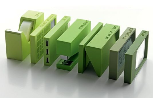 Pensando em uma mesa de trabalho mais organizada e harmônica, os irmãos designers Adrian e Jeremy Wright da DesignWright desenvolveram o projeto BURO Desk Set. As peças do conjunto possuem um design de blocos com mesmas dimensões, contendo calculadora, furador de papel, calendário, fita adesiva, lente, hub de USB e grampeador. Disponível nas cores verde, roxa e cinza.